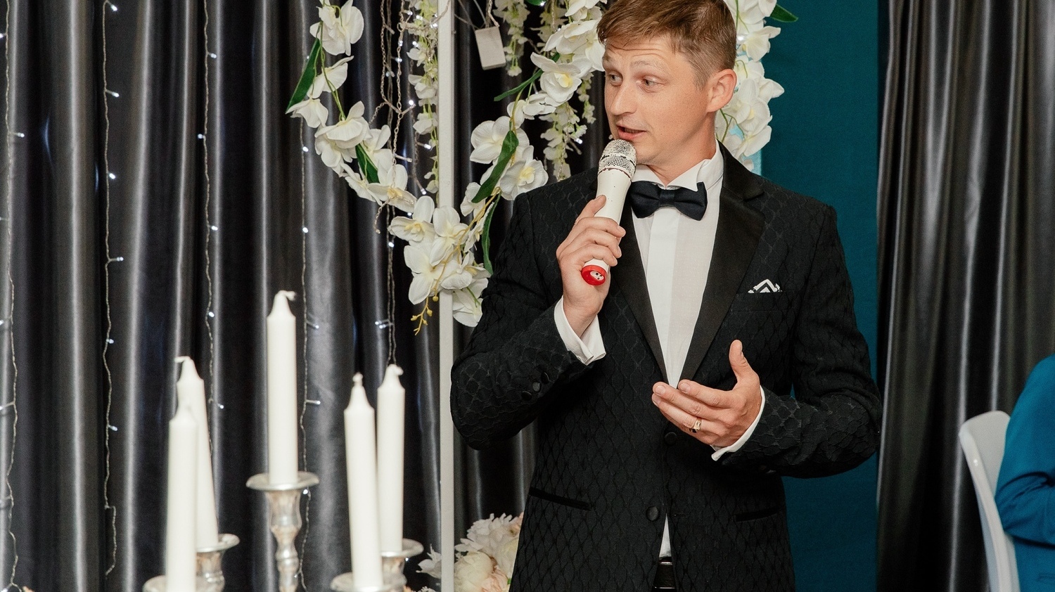Очень яркий праздник получился, Саша был будто не только ведущим, но и организатором, потому что при парочке казусов на банкете (которых, наверное, никак не избежать), он не давал паниковать, и со словами: "Так, вдох-выдох, сейчас я попробую всё решить" - убегал куда-то. И всё решал. Да и перед самой свадьбой всегда был готов помочь любым советом. Гости остались довольны, а их было почти 90, к слову, и по-моему веселились и на месте не сидели. Было и интересно, и весело, и трогательно до слёз. Я до сих пор не могу отойти от всего этого и от эмоций. Было шикарно! От всего сердца спасибо!